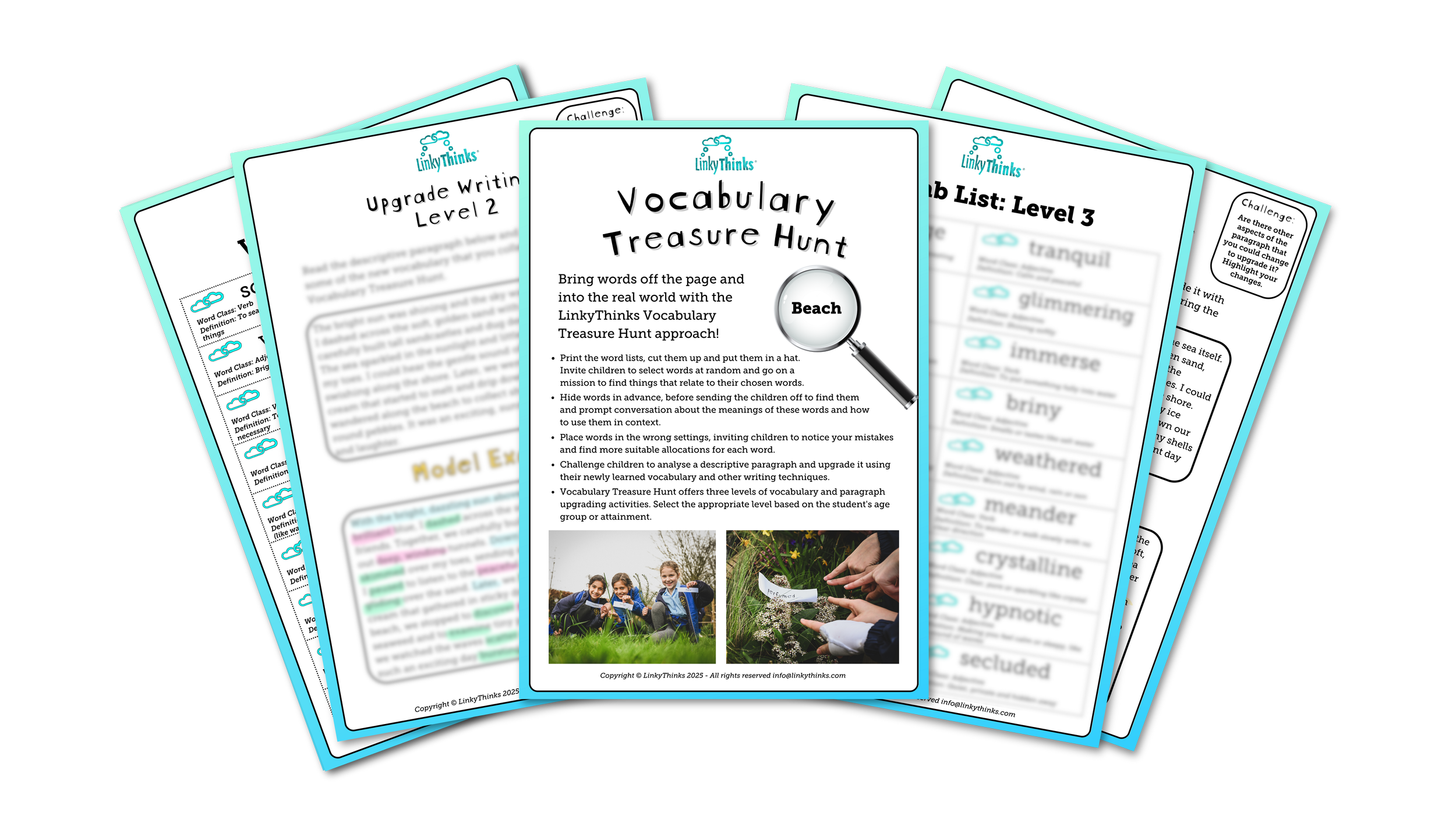 Bring words off the page and into the real world with the LinkyThinks Vocabulary Treasure Hunt! Through multi-sensory learning, this resource encourages children to explore new words in context by finding real-world connections, discussing meanings and discovering creative uses. Interactive activities like word hunts, spotting intentional ‘mistakes’ and upgrading descriptive paragraphs make language learning both engaging and memorable. It’s perfect for fostering critical thinking, creativity and a deeper understanding of vocabulary in a fun and dynamic way!